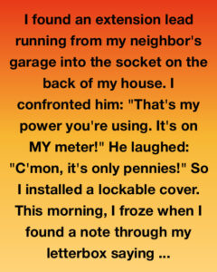 I first spotted the orange cord snaking from Ron’s garage into my outdoor socket. Furious, I locked the outlet. The next day a note arrived: You’re colder than your electricity, mate. We’d once been friendly—shared tools, summer chats—but after his wife died, Ron withdrew. I’d tried with food and visits, but he shut me out. Now, his theft felt like betrayal. Then one night, his house went dark. Through the window, I saw him collapsed on the floor. Paramedics said it was a diabetic episode.