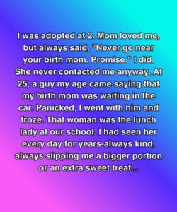 I was adopted at 2. Mom loved me, but always said, “Never go near your birth mom. Promise.” I did. She never contacted me anyway. At 25, a guy my age came saying that my birth mom was waiting in the car. Panicked, I went with him and froze. That woman was the lunch lady at our school. I had seen her every day for years—always kind, always slipping me a bigger portion or an extra sweet treat…