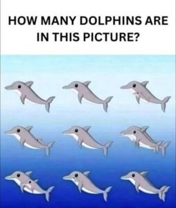 Optical illusions and brain teasers are a fun way to challenge our minds. This dolphin brain teaser hides 17 dolphins in one image—some easy to spot, others cleverly camouflaged within the shapes of other dolphins. The first row has 5, the second and third rows each have 6 dolphins.