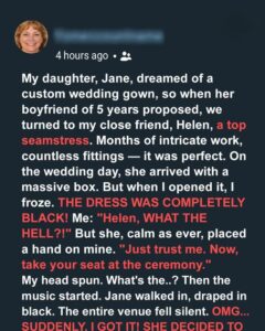The day before, I’d noticed her fiancé Jack acting strangely. On the wedding morning, my friend Helen, who made the dress, arrived with a large box. Inside was a black gown. Jane simply said, “I need to do this, Mom.” I didn’t realize she meant to make a statement no one would ever forget.