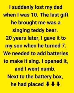 I suddenly lost my dad when I was ten. One day, he was there, laughing, calling me his “little sunshine,” and the next, he was gone. The last gift he ever gave me was a small, soft, singing teddy bear. It wasn’t expensive, but to me, it was priceless. On Christmas morning, I unwrapped it and pressed its paw. A cheerful melody and a silly song about friendship and love filled the room. I giggled, hugged it tight, and Dad smiled like he’d given me the world.