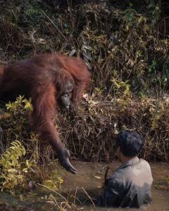 As he struggled through the thick mud, an orangutan on the riverbank watched silently. Then, she moved closer, anchored herself with one hand, and extended the other toward the man — as if offering help.
