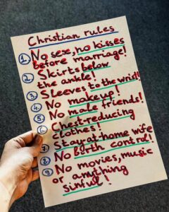 It wasn’t long before Elias sat me down and explained what he called the “guardrails of a holy courtship.” He never used the word rules, but that’s exactly what they were, a list of expectations that left little room for me to be anything but small.