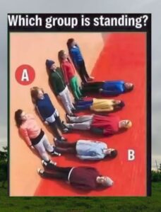 Meanwhile, Group B seems upright — the photo is taken from above at an angle that makes it look like both groups are horizontal, but the lighting and shadows reveal the truth.