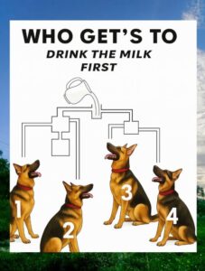 In this puzzle, we need to trace the pipes carefully to see which dog will get the milk first.