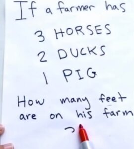 “If a farmer has 3 horses, 2 ducks, and 1 pig, how many feet are on his farm?”