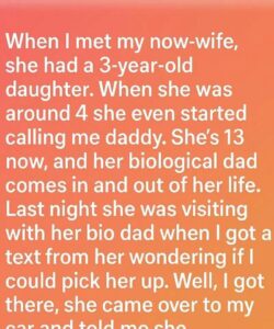 When I met my now-wife, she had a 3-year-old daughter. When she was around 4 she even started calling me daddy. She’s 13 now, and her biological dad comes in and out of her life. Last night she was visiting with her bio dad when I got a text from her wondering if I could pick her up. Well, I got there, she came over to my car and told me she didn’t want to stay there anymore. Then, right as she buckled in, she looked at me and asked, “Can I just call you Dad again? For real this time?”