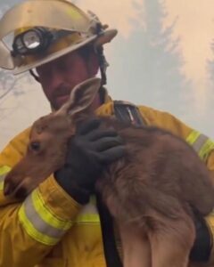 He turned toward the cry. Through the thick smoke, his flashlight beam caught a glimpse — a baby moose, tangled in fallen brush, its small body trembling. The animal’s cries cut through the heat and fear, reaching something deep inside the firefighter. Without hesitation, he made a choice that would change his life.