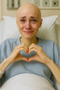 The hospital room was quiet, the kind of quiet that feels heavy—almost sacred. Machines hummed softly in the background, their gentle beeping marking the passing of moments she wished she could freeze. The woman in the bed, fragile and thin beneath the pale blue gown, pressed her hands together in the shape of a heart. Her smile trembled. Her eyes, red from tears, glistened with both pain and gratitude.
