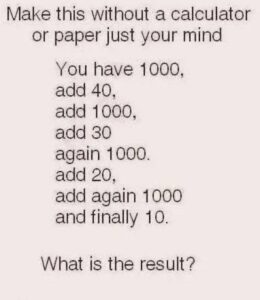 This puzzle is a common mental math trick. Many people mistakenly arrive at 5000 because their brain adds incorrectly when dealing with numbers in the 1000s and smaller values like 40, 30, 20, and 10. However, when carefully calculated, the correct answer is 4100.