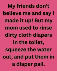 At the center of the memory is the writer’s mother and her daily ritual. When a diaper was soiled, she didn’t hesitate. She rinsed it directly in the toilet, wrung it out by hand, then dropped it into a diaper pail until laundry day. It was messy, repetitive, and tiring — yet she handled it with the ease and determination that defined so many parents of that era. What sounds shocking or unsanitary to contemporary ears was once completely normal.