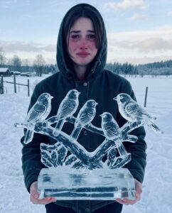 I spent the whole morning shaping that block of ice with my bare, trembling hands. The wind was so cold it felt like it was trying to carve me while I was carving the birds. Every breath turned into a white cloud that hung in the air like unspoken words, and every chip of ice that fell sounded like a tiny heartbreak hitting the ground.