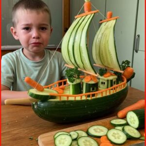 Liam’s eyes lit up in a way only a child’s can. Together, they sliced, carved, arranged, and imagined. The cucumber became the hull. The carrot sticks became rails. The sails were thin, delicate sheets of cucumber skin. Every tiny detail was shaped with patience, love, and a hope that it would make her son feel special—even just for a moment.