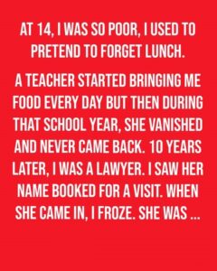 At 14, I was so poor I used to pretend I forgot my lunch. It was easier than admitting there was no food at home. My mom worked nights at a dry cleaner, rent was barely paid, and my dad had disappeared years earlier. I spent lunch in the library, hungry and trying to hide it—until Ms. Grennan started showing up. First a banana “left behind,” then a granola bar “extra from the lounge.” Eventually she handed me sandwiches with a soft smile and no questions. Then one Monday, she was simply gone. No explanation.