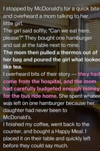 The mother’s thin coat looked inadequate for the weather, but she still bent down to whisper to her daughter with warmth in her eyes. When they reached the counter, I heard the mother order a simple meal: “Just the cheeseburger and small fries.” The girl tugged her mother’s sleeve. “Mommy, can I get the toy?” she asked softly. Her mother hesitated before answering, “Maybe next time, sweetie. Just food today.”
