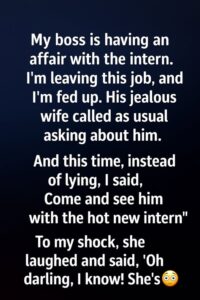 When I first started my job, I never imagined it would turn into a daily soap opera. My boss, a charming man with too much confidence, had everyone fooled — except me. Rumors swirled for months about him and the new intern, and the tension in the office grew thicker by the day. I tried to stay focused, but the constant drama made it impossible. Eventually, I decided it was time to leave for my own peace of mind.