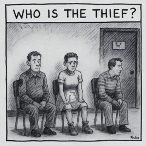 The two men have nothing in their hands and look more like they were brought in for questioning, but she is the only one with an object that could be linked to a theft.