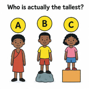 • A is standing on the ground — and comparing their real heights, A is actually the tallest.