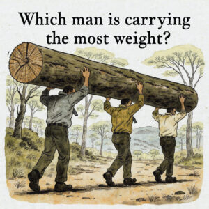 Here’s why: the log is thicker and therefore heavier on the left side. Because the log’s weight isn’t evenly distributed, the man closest to the heavier end must support a greater share of the load. The men toward the right end carry progressively less.