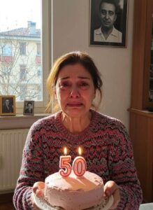 But on this day, it illuminated the tears streaming down Elena’s face as she held a small pink cake with the red candles shaped like the number 50.