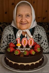 She sat quietly at the table, her hands slightly trembling as the soft glow of three candles—1, 0, and 0—danced across her face. A warm smile formed on her wrinkled lips, the kind of smile that hides a lifetime of stories, aches, and memories…