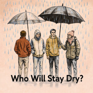 In the illustration, four people are standing in the rain, but only one of them is fully protected by an umbrella: