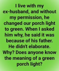 At first, Meridith barely noticed the porch light. It was just green—just one of Darion’s quirks. Two years after their divorce, they were still living under the same roof out of necessity, not love. Separate lives, shared bills, quiet tension. But the glow began to bother her. One night she finally asked, “Why the green light?”