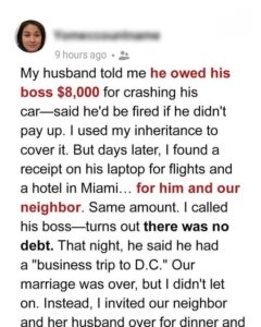 I was married to Mike for seven years and believed we were true partners, sharing trust and dreams. When my grandmother passed last spring, she left me $15,000. I told Mike, expecting support, and his calm reassurance made me feel safe. I had no idea that honesty would soon open the door to betrayal.Three months later, Mike came home looking distressed. He said he’d crashed his boss’s car and needed $8,000 to keep his job. Without hesitation, I transferred the money, believing I was protecting the man I loved. I felt proud to help him, certain we were a team.