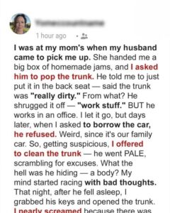 Celia never imagined she’d feel uneasy in her own marriage, but when her husband Adam stopped her from opening the car trunk, something felt off. His excuses didn’t fully add up, and a tiny doubt settled in her mind. Busy days blurred by with kids, errands, and work, yet the thought lingered. Why the secrecy over something so simple? When Saturday rolled around and the car was still off-limits, curiosity turned into quiet worry.