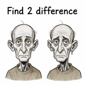 Right earring – left ear larger – hair on right – eye brows – nose on left is straight on – eyes on right looking straight – Adam’s apple is bigger on left – frown marks on on right are deeper