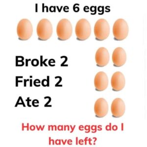 How? Well, if I had six eggs. Then I broke, cooked, and ate two of them, I’d still have four eggs. The text is written to fool you into thinking that all the eggs are gone. Clever, right?